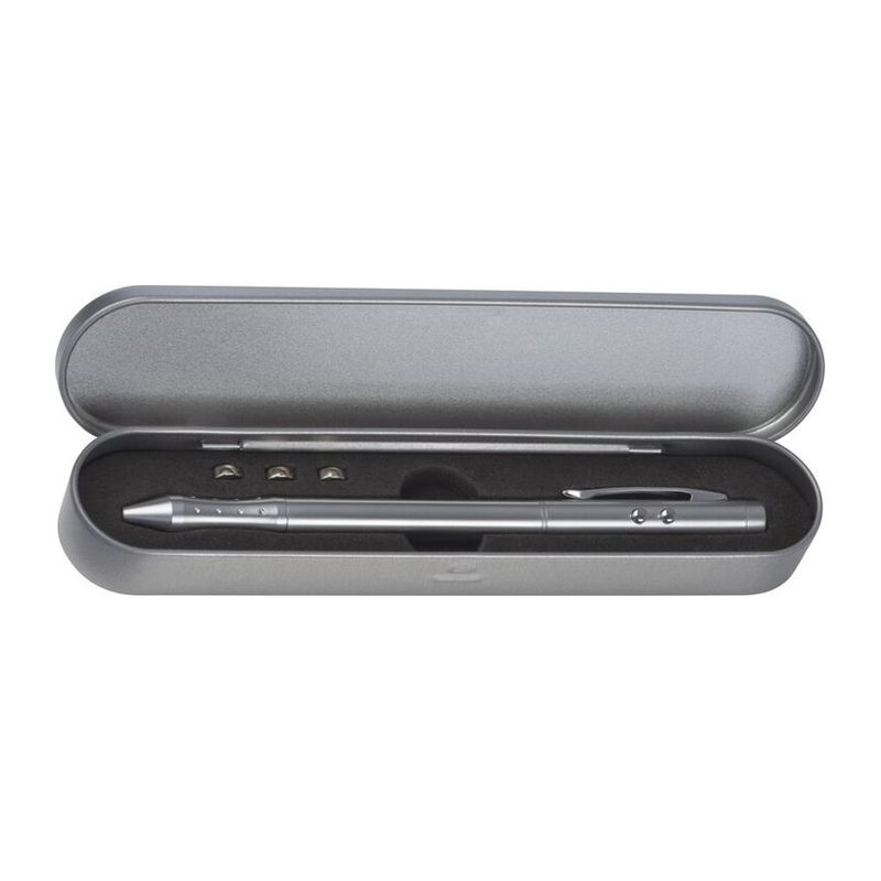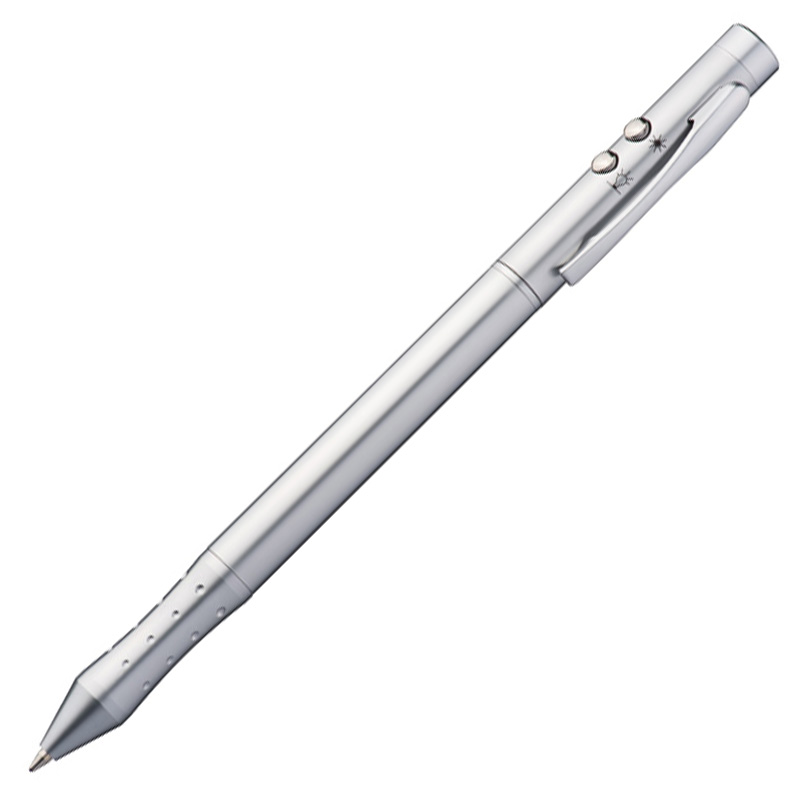 Opis: Laser kemični svinčnik, z modrim in rdečim polnilom ter laserjem in led lučko (3 gumbne baterije so priložene). Z obračanjem zgornjega dela lahko izbirate med modrim in rdečim kemičnim svinčnikom, v darilni embalaži.