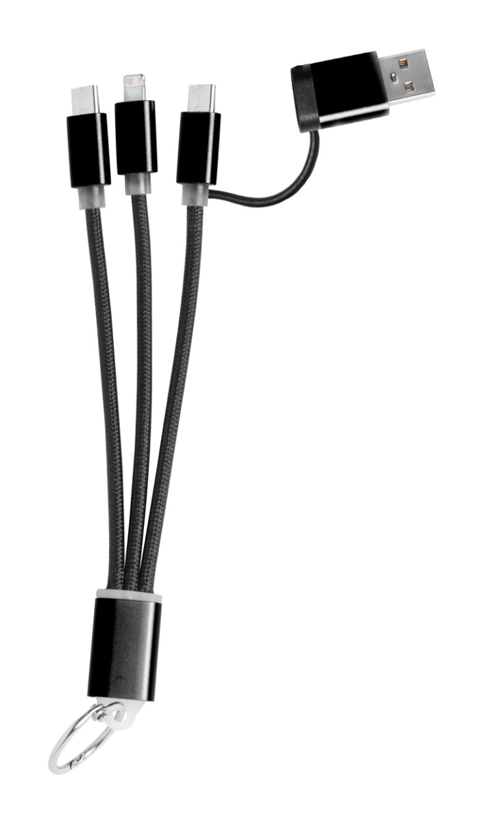 Opis: obesek z USB/USB-C polnilnim kablom, ki ima priključke za micro-USB, USB-C in Lightning.