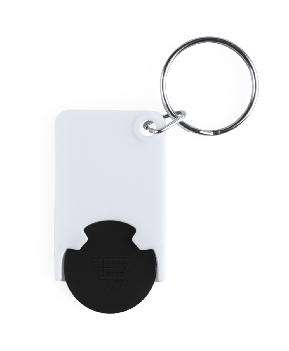 Opis: obesek za ključe v beli barvi z barvnim žetonom za trgovinski voziček.