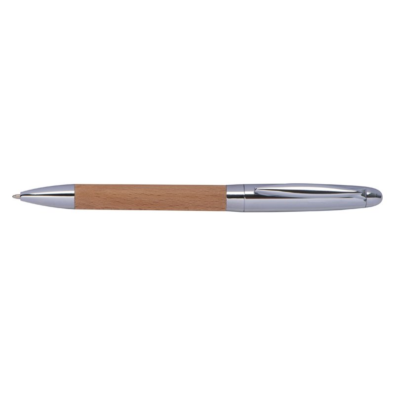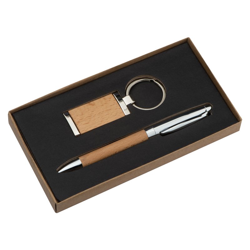 Opis: set kemični svinčnik in obesek v kombinaciji kovine in lesa v darilni škatlici. Pisalo piše modro