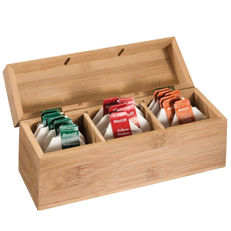 Opis: škatla za čaj iz bambusa, v vsako vrstico gre po 10 čajev, ki so varni pred vlago. Čaj ni priložen.