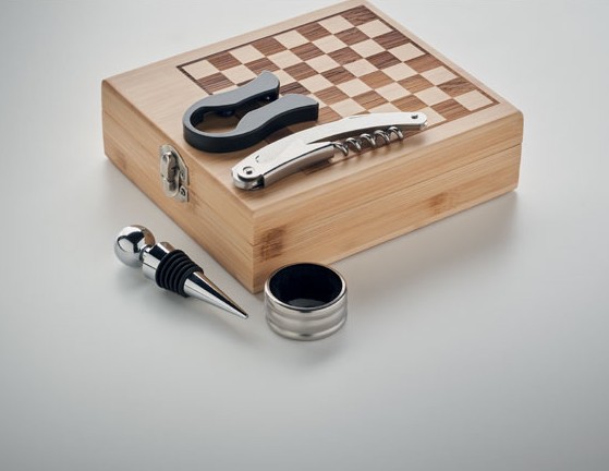 Opis: elegantno zasnovan komplet za vinske užitke, zapakiran v bambusovo škatlo s šahovsko ploščo na pokrovu škatle. V notranjosti se skrivajo ključni pripomočki za vsako vinsko priložnost: odpirač za vino z nožem, zamašek za steklenico, rezalnik folije in obroček proti kapljanju. Popolno ravnovesje med zabavo in uživanjem – odlična izbira za poslovna darila ali posebne priložnosti.